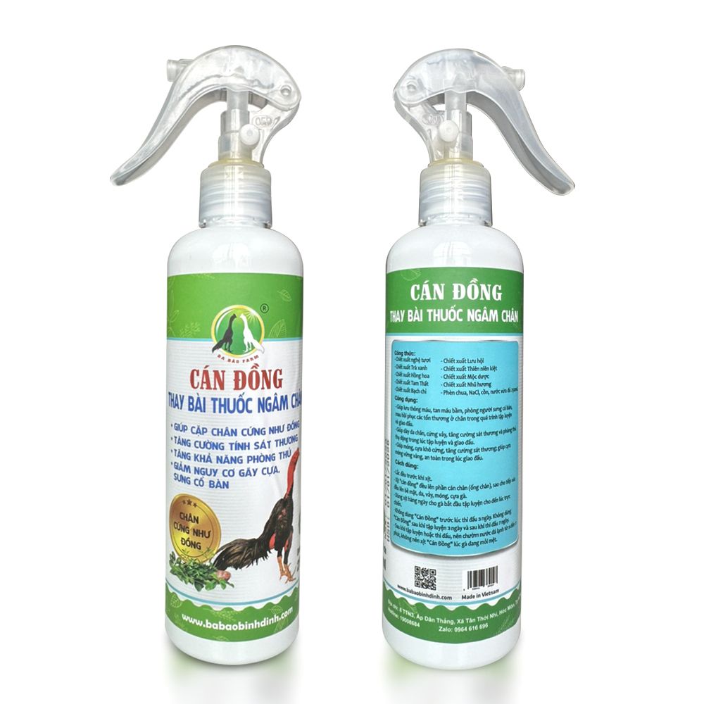 - Xịt '' Cán đồng '' đều lên phần cán chân ( ông chân ), sao cho tiếp xúc đều lên bề mặt, da, vảy, móng, cựa gà.